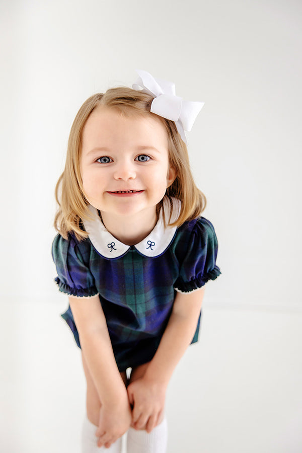 From the bow detailing on the collar, to the ruffle sleeve, our Bedford Bubble is sure to melt your heart. Featuring Berwick Black Watch with Worth Avenue White & Nantucket Navy Bows, this little bubble is sure to be darling on your little lady!