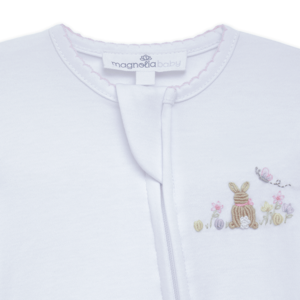Embrace the joy of the Easter season with this convenient zip footie in luxurious Pima Cotton. Adorned with a delightful hand-embroidered bunny and finished with sweet picot trim, this piece is designed for fuss-free dressing and festive fun.