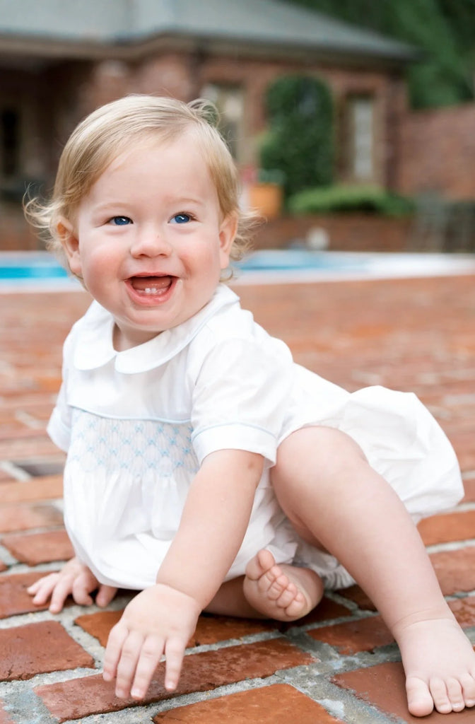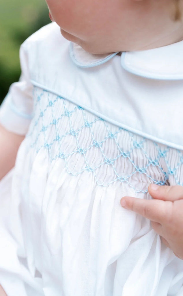 Blessings White Batiste with White Trim and Blue Smocking
