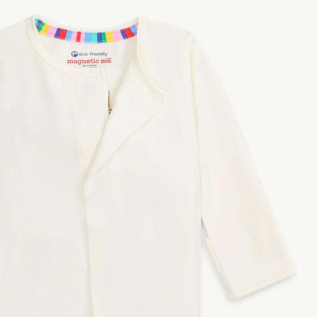 - magnetic closures: magnets line the seam from the neck to upper thigh for sizes up to 0-3m & from neck to crotch for sizes 3-6m and up.