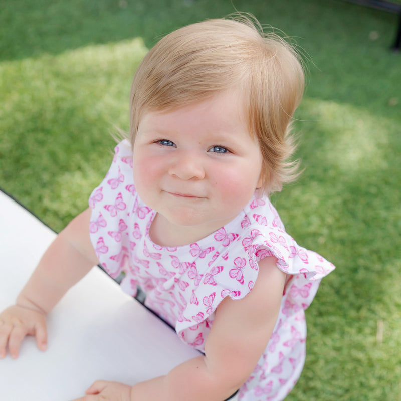 Girls' short sleeve bubble with piped seam at chest and ruffled neck. Snap closure in back and three snaps in the stride. Made from 100% Peruvian Cotton.