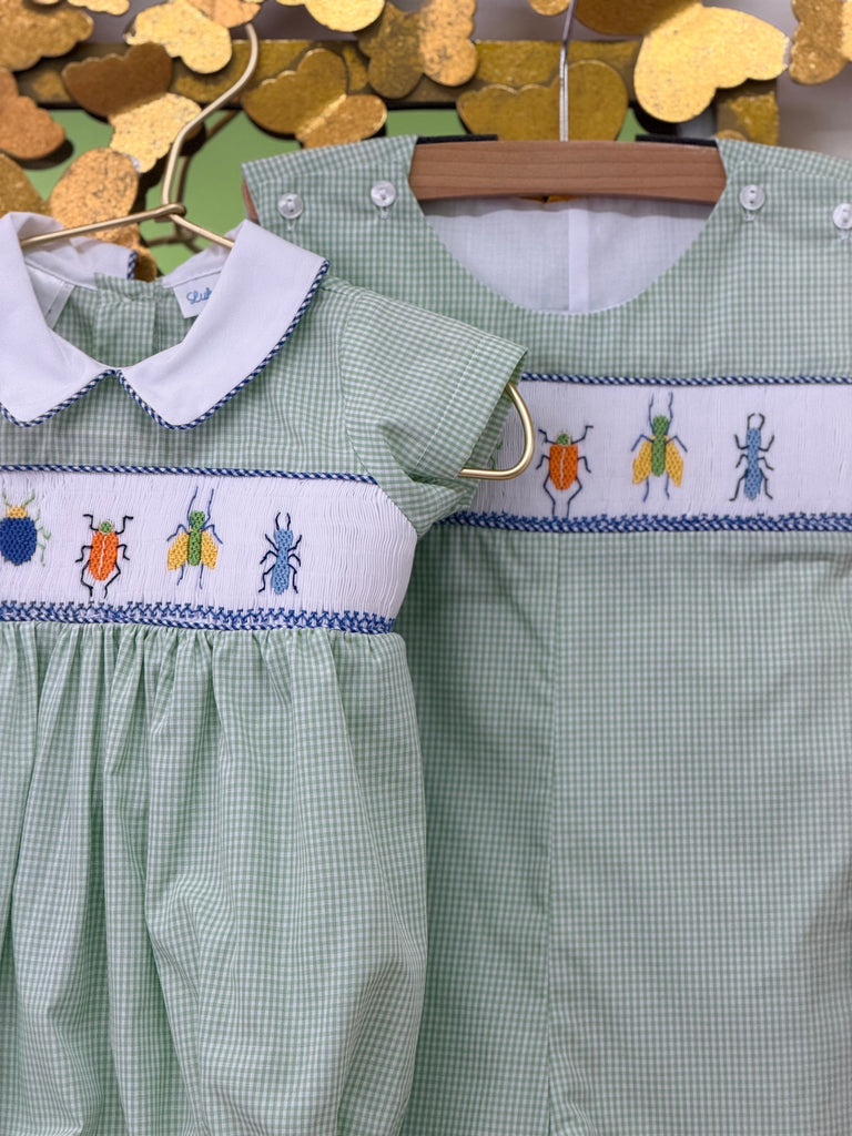 by Lulu Bebe; match baby brother in the insect smocked bubble and big brother in the insect smocked short set